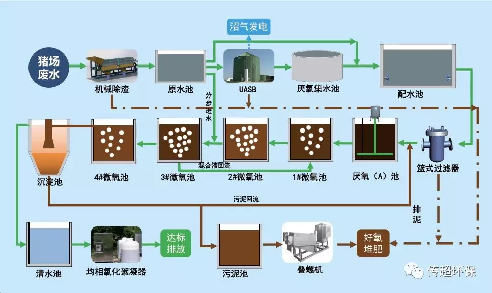 针对畜禽养殖废水厌氧沼液可生化性较差(B/C <0.3)、碳氮比较低(C/N<5)、总氮削减难度大等共性问题,传超环保科技联合浙江大学环防所以短程硝化反硝化(PND)和同步硝化反硝化(SND)原理为基础,通过优化集成养殖废水预处理、SFAO4微氧曝气生物处理、自养脱氮耦合反硝化除磷、均相氧化絮凝处理等关键技术,创建了新型畜禽养殖废水高效低耗脱氮除磷成套化技术模式,并在万头以上规模猪场建立工程示范。